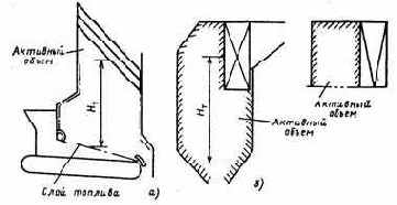 а —топка для слоевого сжигания топлива; б — топка для факельного сжигания топлива при наличии ширм.